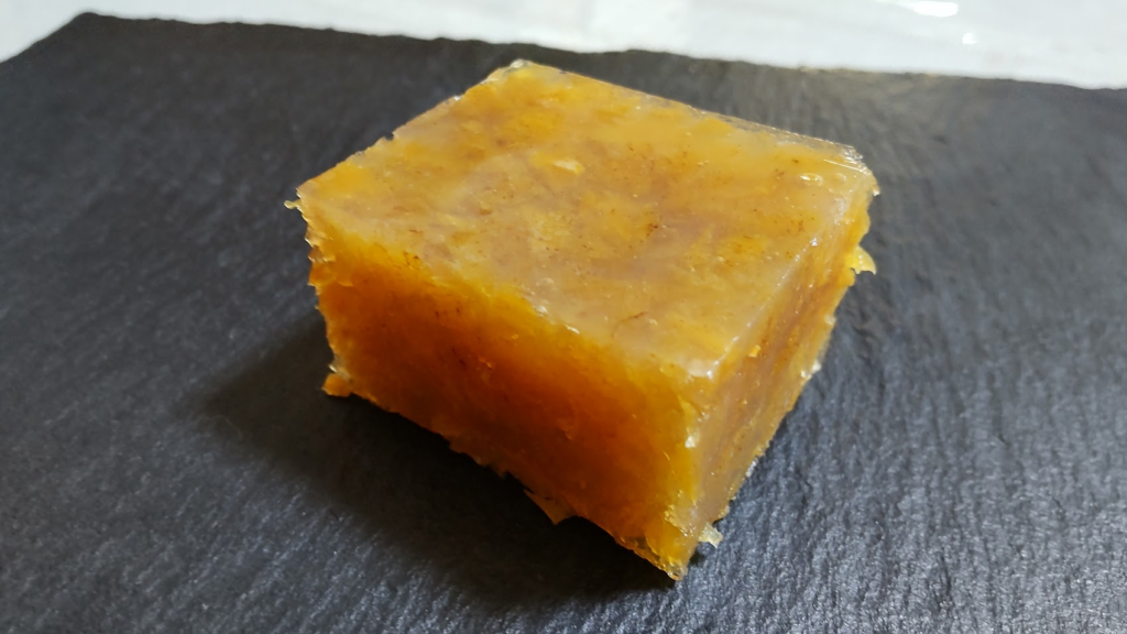 完熟した甘柿をピューレし、砂糖、寒天でゼリー状に煮詰め、器に流し込んだもの。