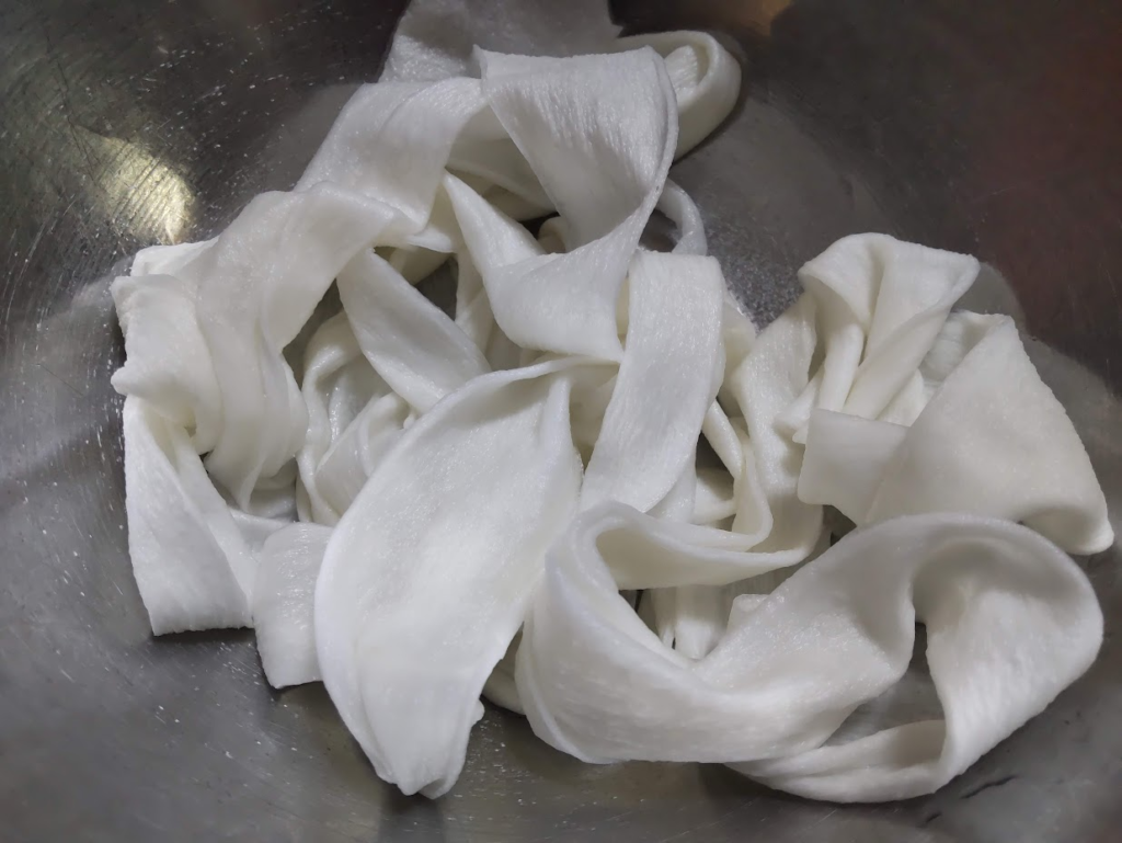 ②かんぴょうは、水洗いし、塩をふりかけてもみ洗いします。塩を洗い流し、たっぷりのお湯で好みの硬さになるまで茹でてください。かんぴょうの幅(太さ)は1センチくらいになるように、切り分けておきましょう。長さは長いままにしておきます。