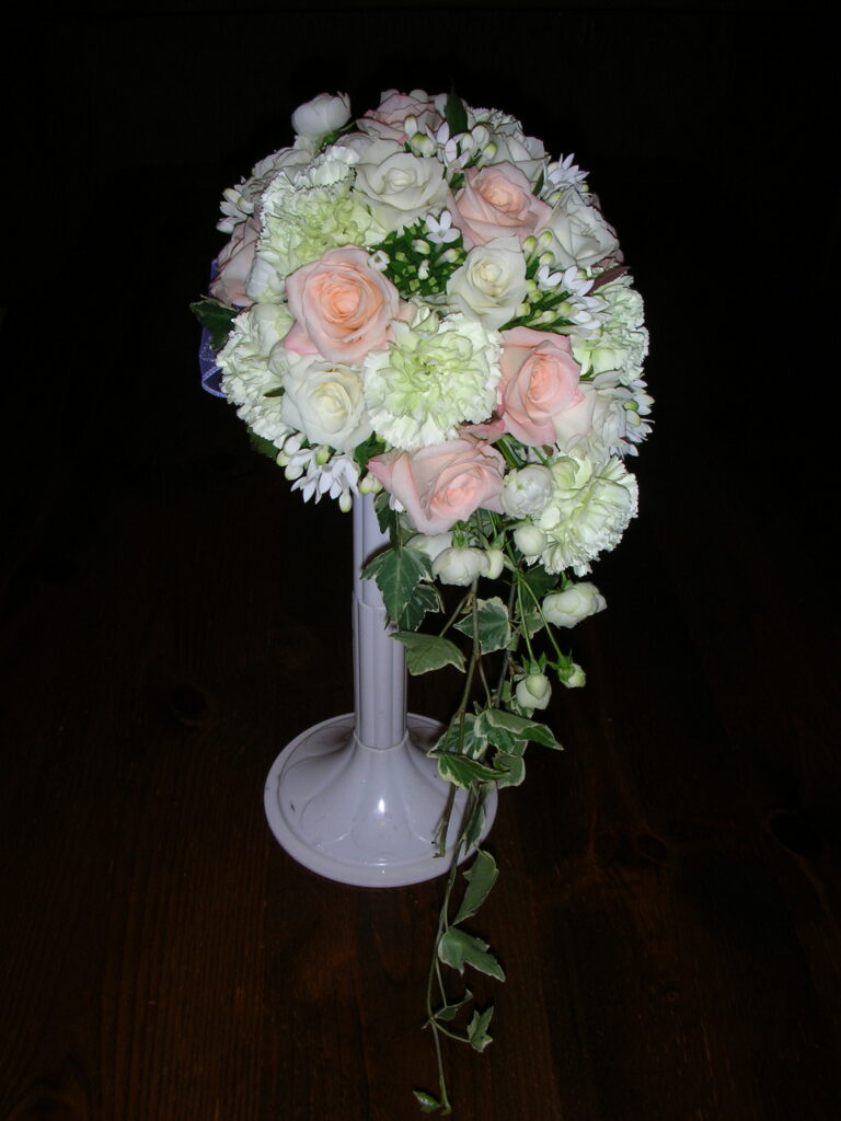 ブーケのタイプでのマフ型は、下の写真のような筒状のものの両サイドからお花が垂れ下がるタイプや、筒状の部分全面からお花が垂れ下がるタイプもあります。