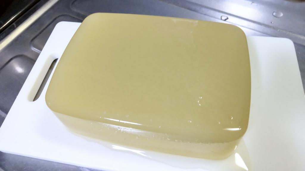天草などの海藻を煮溶かして、ろ過した液体を固めたものが「生寒天」です。ところてんやみつ豆、あんみつなどで食べられます。