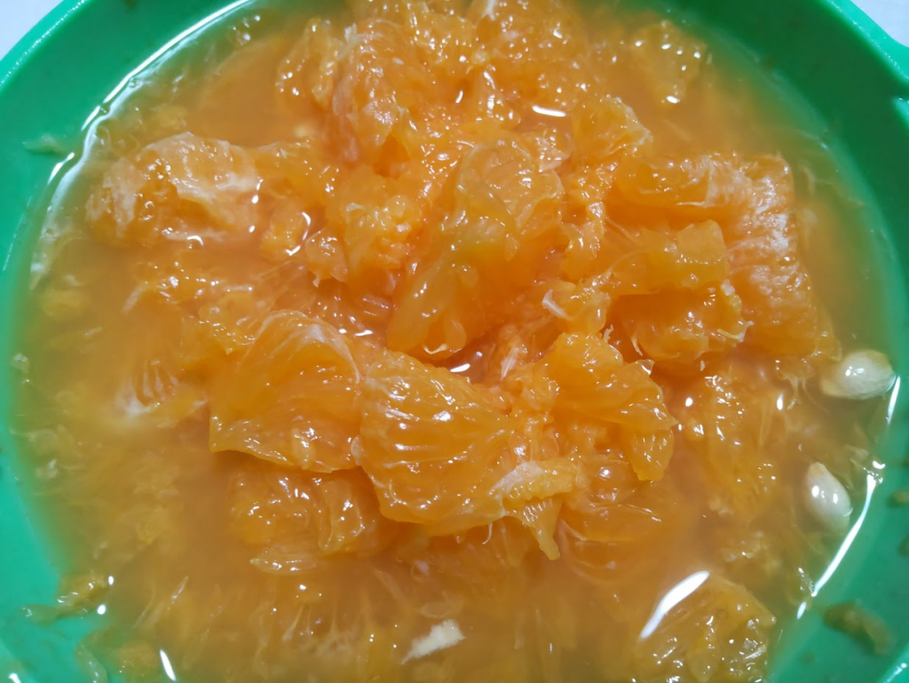 ⑤実の薄皮を取っていきます。果汁がこぼれると勿体ないので、薄皮をむいた実と果汁ごとボールに入れていきます。その際に種がでてきたら、別のボールなどに入れておきましょう。種は使います。薄皮は必要ありませんので捨ててください。