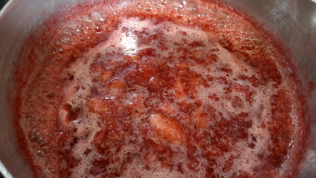 いちごの粒は、完全につぶしてもよし、半分潰して半分粒のままでもよし、粒をすべて残すもよしです。お好みでどうぞ。私はマッシャーで潰せる範囲でほとんど潰してしまいます。