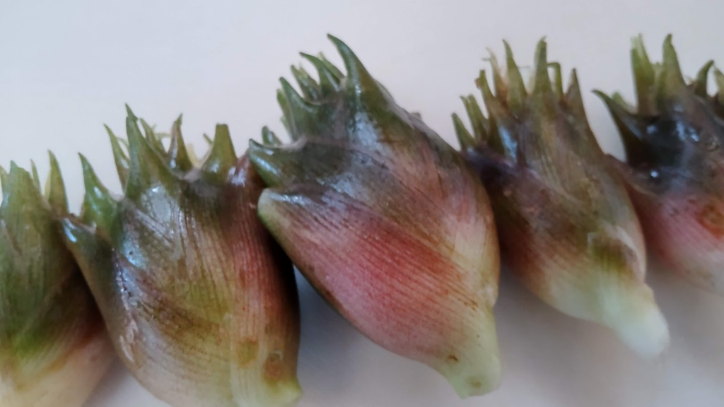 花のつぼみはみょうがなので、花びらのつぼみという表現をさせていただきます。この花びらのつぼみは5センチほどまで伸びます。ほかにも、この中にたくさんの白いつぼみが、花を咲かせようと待機しています。