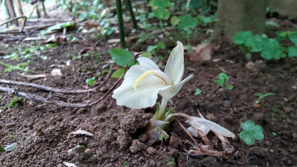 白くて透き通った花びらは、先端が3裂し、大きな中央の裂片が立ちます。内側に1本の雄しべと雌しべがあり、仮雄しべが唇弁状になって前面に突き出します。神秘的な姿はとても綺麗です。そのままにして、見ていたいくらいですが、残念ながら1日花です。